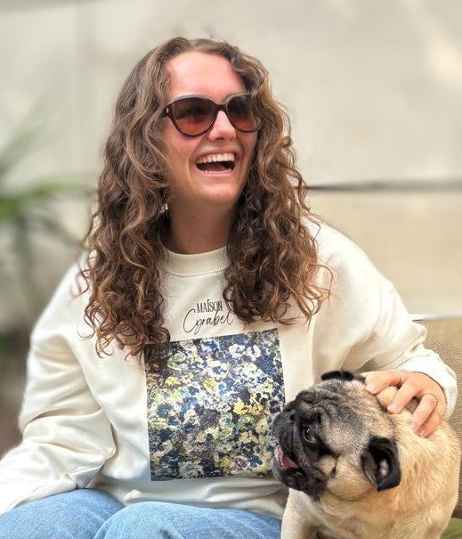 Annabel Bianco BarachLe floral revient. Pas en robe — en sweat sérigraphié à Cannes par Cyril, sur une toile d’Annabel. Art porté, édition limitée, atelier cannois.