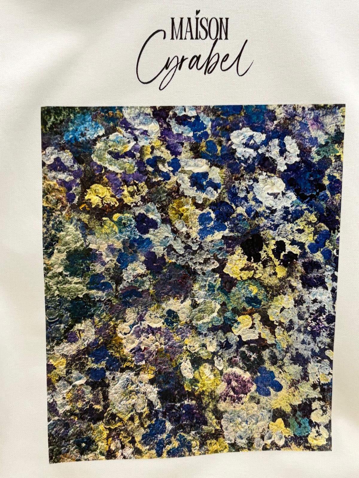 Au centre, un extrait de l’œuvre originale "Hortensia" signée Annabel : une explosion florale, vibrante et instinctive, comme un souffle coloré posé sur la matière.
