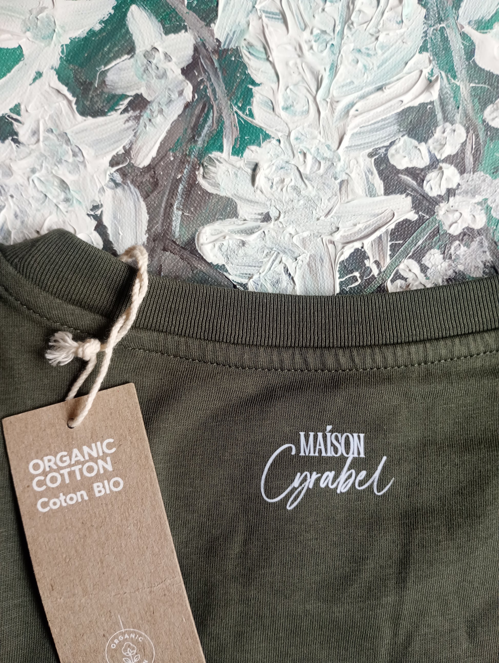Ce tee-shirt Organic kaki, d’une profondeur subtile, vous enveloppe telle une brume douce en fin de journée. Son cœur, délicatement orné de touches florales abstraites, évoque une nature silencieuse et presque onirique — un hommage à l’esprit Frenchies et à la sensibilité artistique unique de Maison Cyrabel.