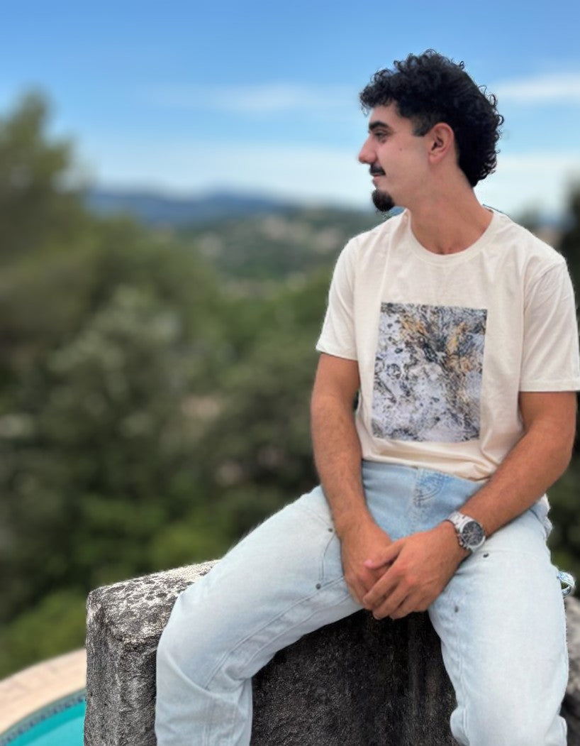 Ce tee-shirt issu de la collection Master Piece capture un fragment vibrant de l’œuvre originale "Metal", portée ici par ENZO.