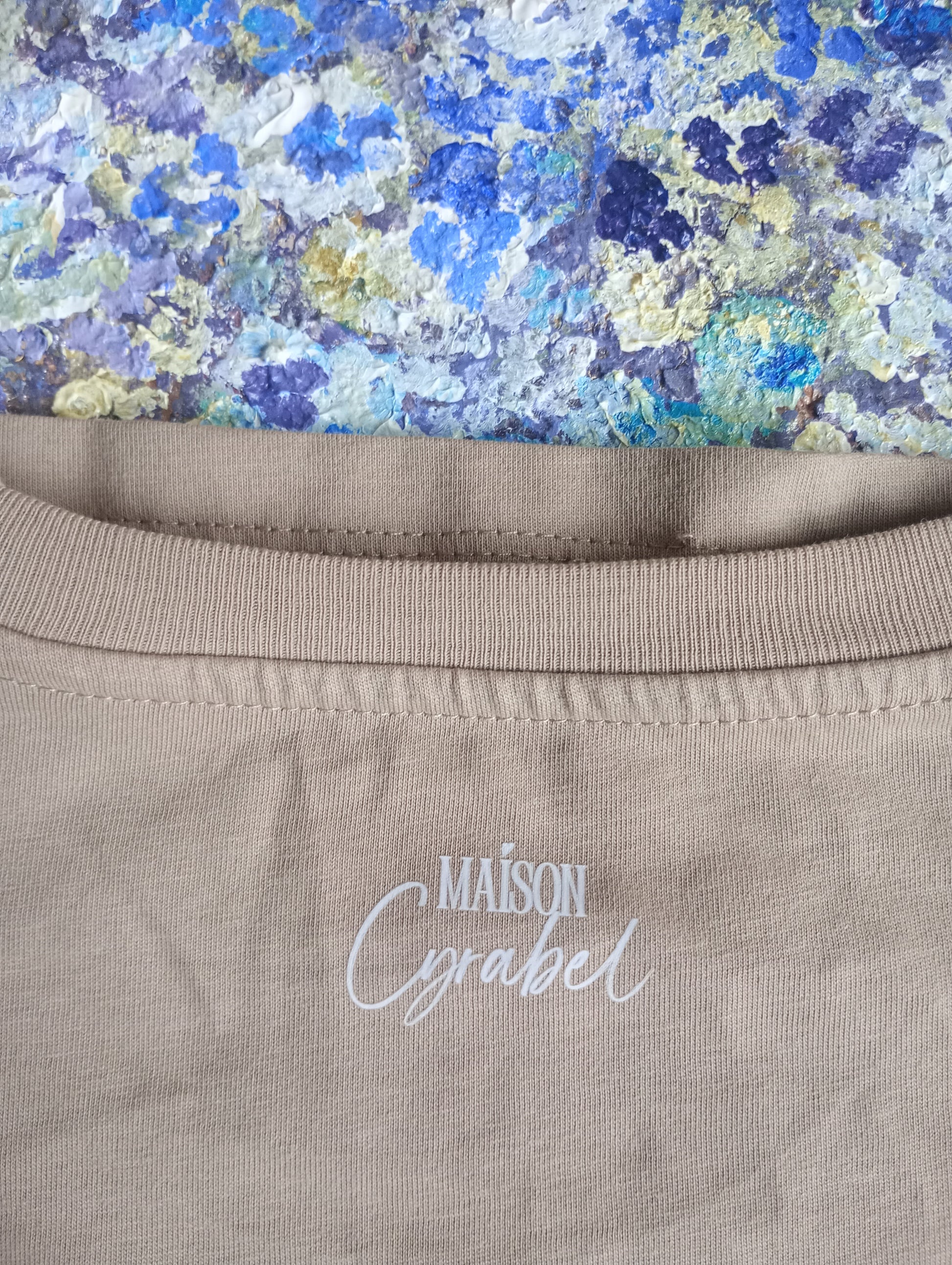 Ce tee-shirt couleur sable d’une délicatesse subtile, vous enveloppe telle une brume douce en fin de journée. Son cœur, délicatement orné de touches florales abstraites, évoque une nature silencieuse et presque onirique — un hommage à l’esprit Frenchies et à la sensibilité artistique unique de Maison Cyrabel.